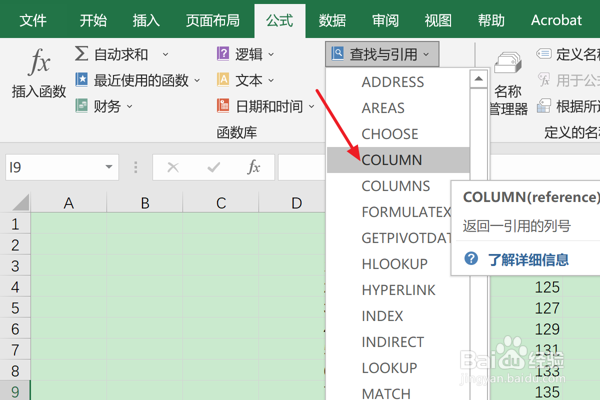最后在下拉菜单中,选择“COLUMN”函数即可。