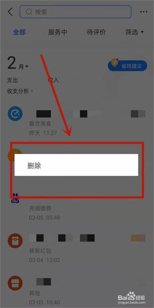 最后长按选定的账单,在弹出的页面中选择删除即可。如图所示:
