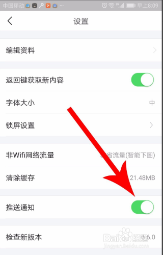 在“设置”列表倒数第二行的位置(见下图)找到“推送通知”设置项,可以发现其右侧的锁定按钮是绿色的,证明此项功能是开启的。