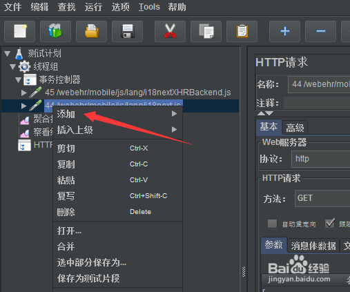 右键请求选项之后,弹出了下拉菜单选中为 添加 选项