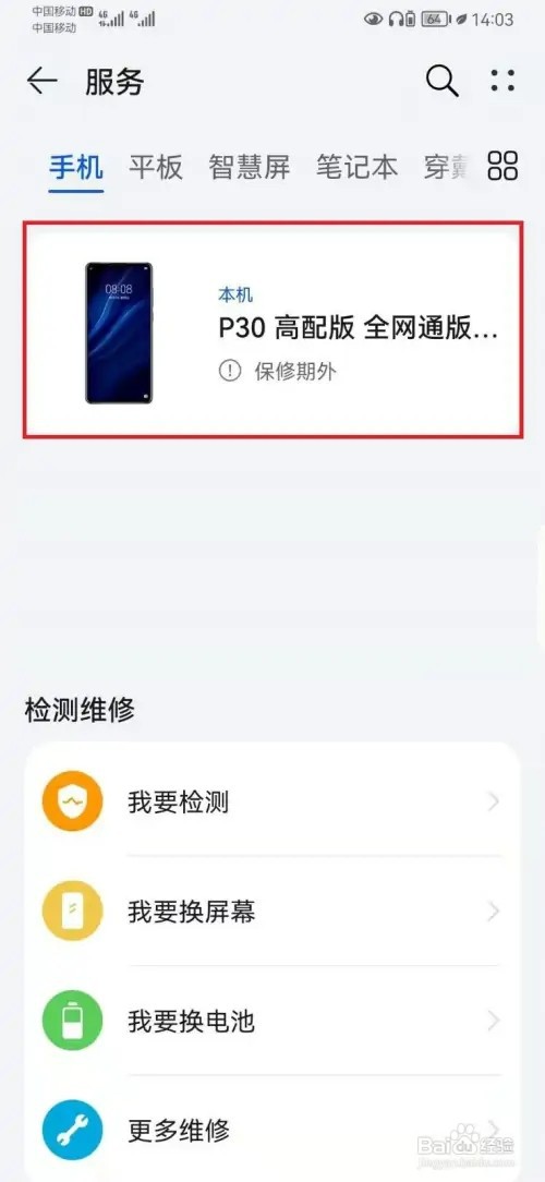 在华为手机我的华为应用页面,打开服务窗口,选择华为手机设备。