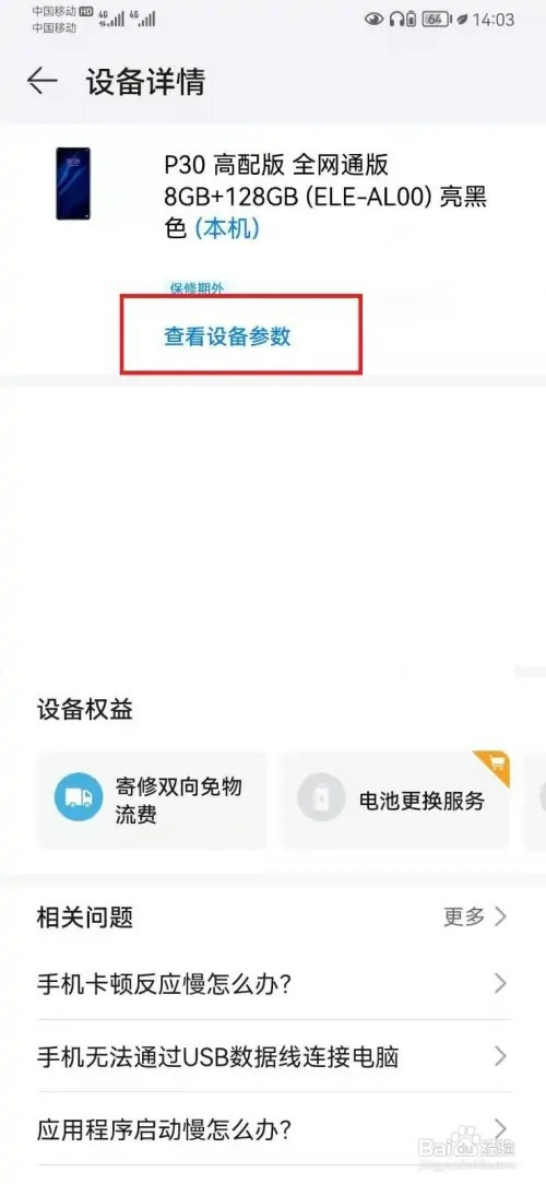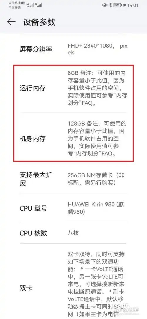 在设备参数页面,查看手机的【运行内存】和【机身内存】等信息即可。
