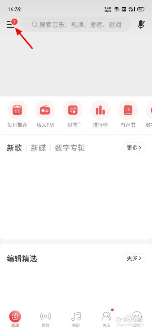 第一步,在网易云音乐界面,单击左上角【菜单】。