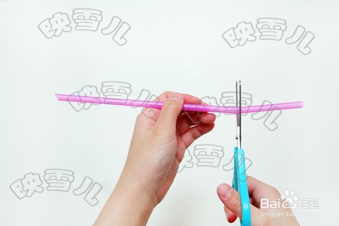 用剪刀在长吸管大约三分之一处剪个口子,使它几乎断开,但还要连着一点