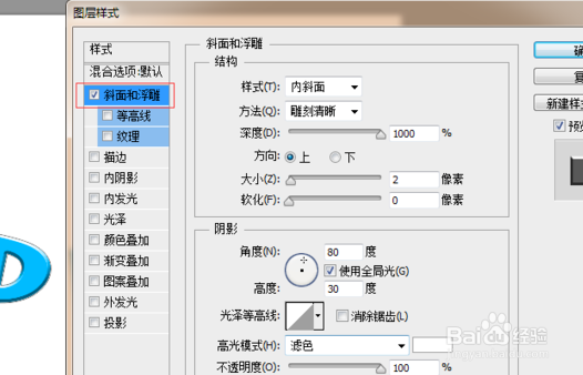 双击图层弹出图层样式框,选择斜面和浮雕,如图调整填写数据,点击确定。