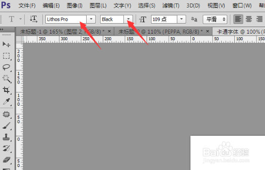 选择文字工具,以写出大写字母PEPPA为例,字体选择Lithos pro Black,颜色改为蓝色。