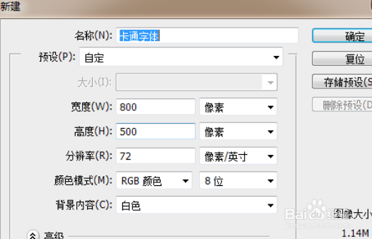 新建一个800*500尺寸,分辨率为72的画布,命名为卡通字体,如图所示。