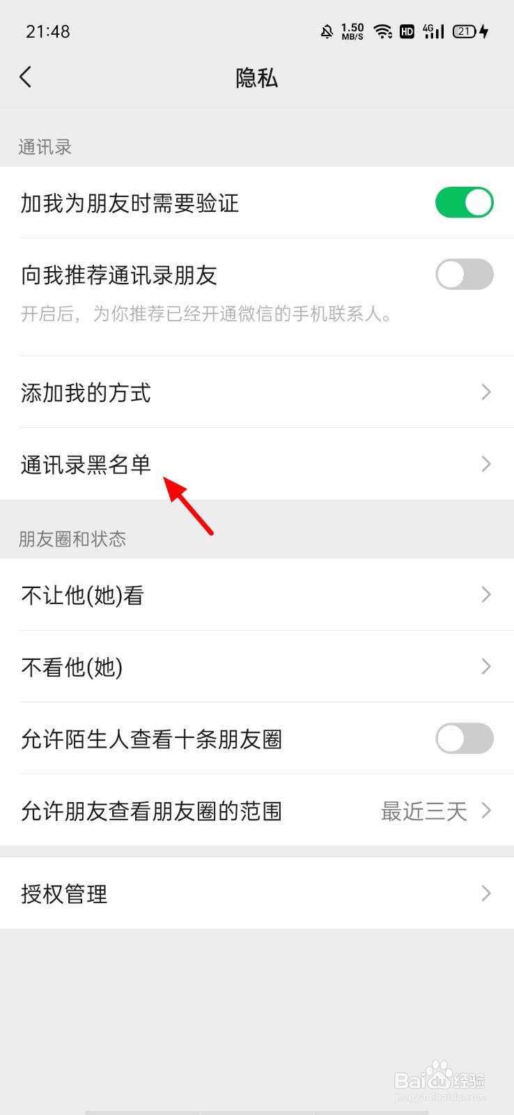 在隐私页面,点击 通讯录黑名单;