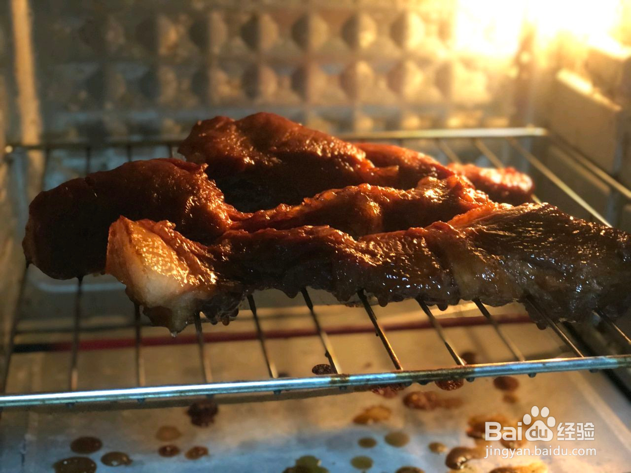 上烤架,碗里腌制的料汁放在旁边备用,上下火180℃先烤20分钟;翻面上下火200℃继续烤20分钟;最后转180℃再烤20分钟
