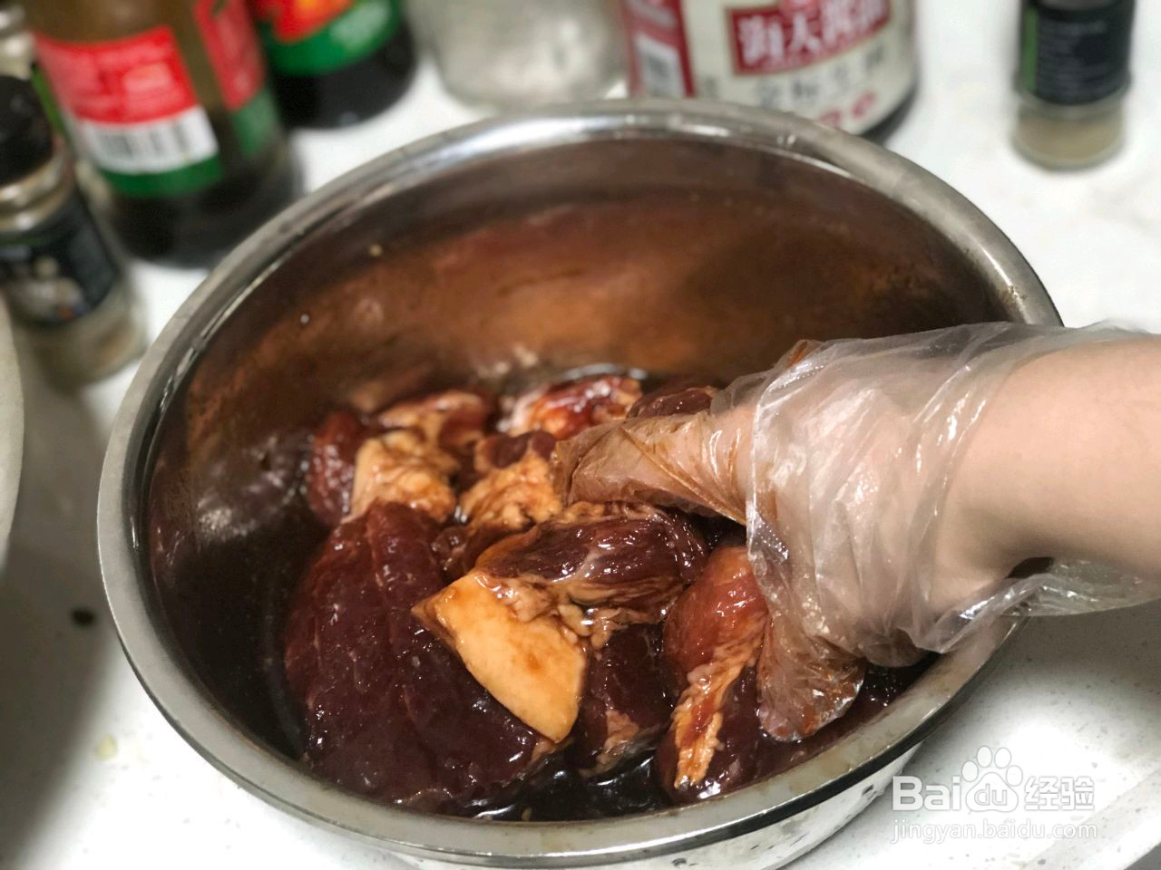 带上手套,抓拌均匀,给肉充分按摩
