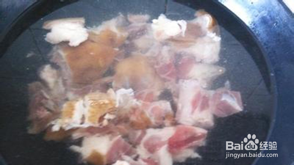 第二步:洗猪脚。猪脚由于存放太长时间以及烤制后皮会比较难以清洗以及较硬,因此需要使用热水清洗,将猪脚放入冷水中,使用慢火将水烧热,然后进行清洗,这样就是比较干净,连续清洗几次就可以了。