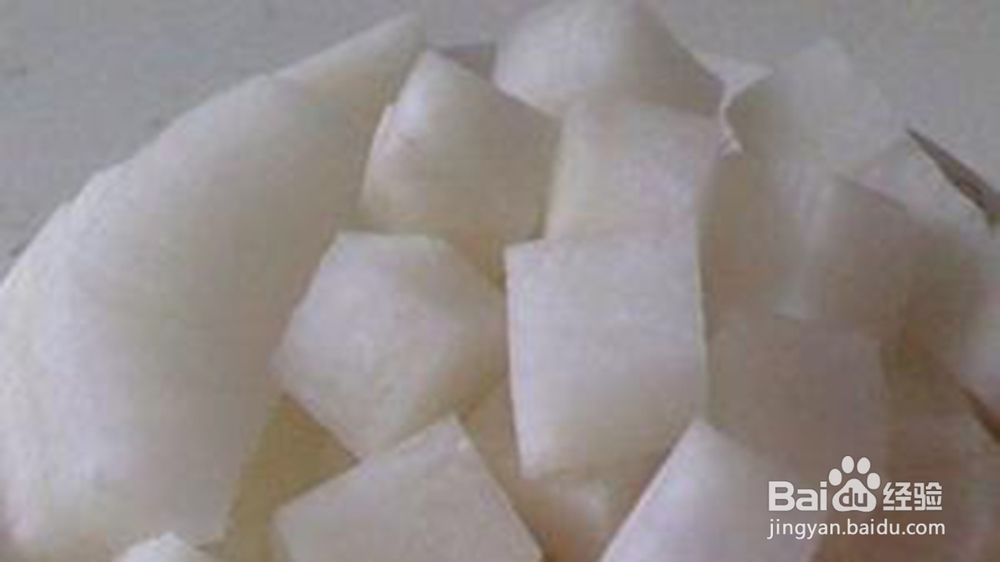 第四步:其他辅助菜系的准备。猪脚一般可以和萝卜以及海带来进行一起炖制,因为萝卜的一种鲜味可以弥补猪脚的缺少鲜味这个特点,海带可以增加一些不一样的味道,然后准备好这两种辅助菜系,清洗干净,萝卜切成块,海带也是一样,切成一块一块的。