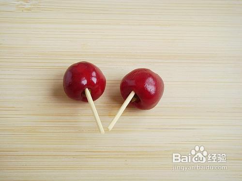 取一根牙签剪成两段插在樱桃上,再插在步骤九的螃蟹身体上做眼睛,大功告成