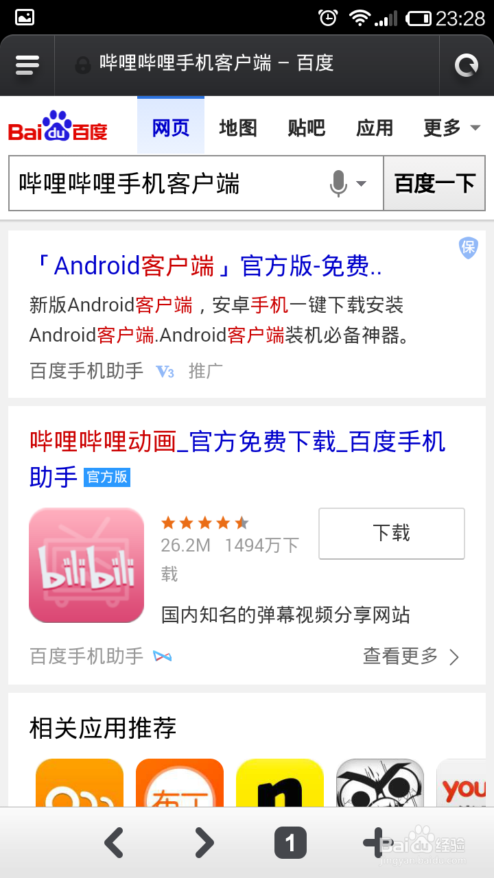 首先,手机上必须安装哔哩哔哩手机客户端,如果没有,进入百度搜索哔哩哔哩手机客户端,然后点击下载。