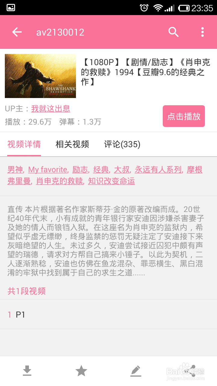 最后点击“播放”,经过瞬间缓冲,我们就可以观看到此片经典电影。很多网站播放《肖申克的救赎》电影是要收费的,如果我们没交费是不能播放的。当然,还有其它很多精彩的收费电影都可在哔哩哔哩手机客户端观看。