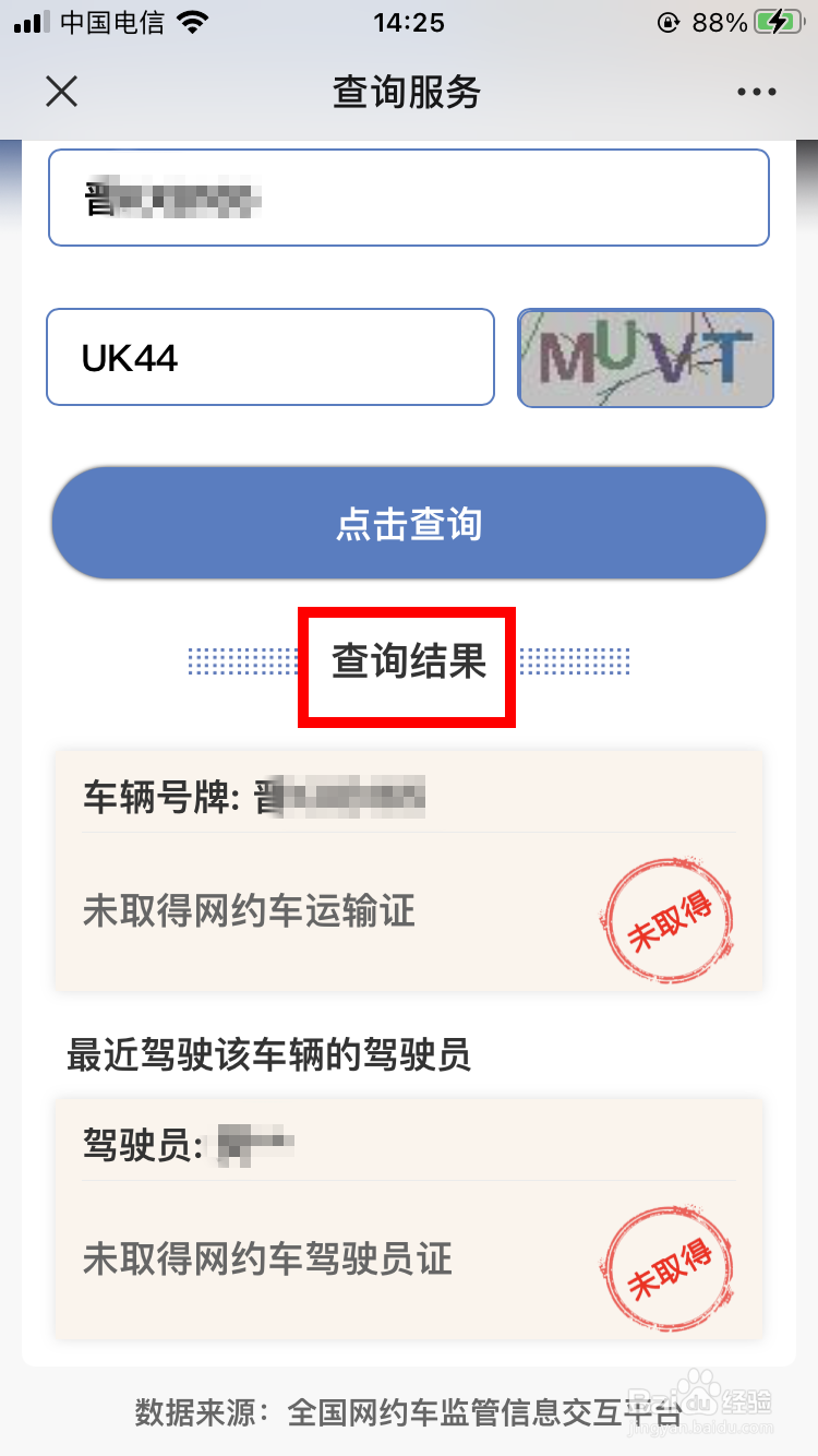 这样就会查询到该车辆是否去的网约车运输证以及最近驾驶该车辆的驾驶员是否取得网约车驾驶员证,表示该网约车是否合规。