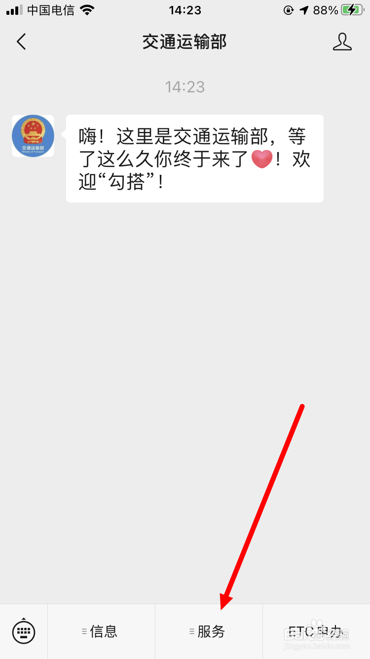 首先在手机上打开并登录微信,进入【交通运输部】,并点击【服务】。