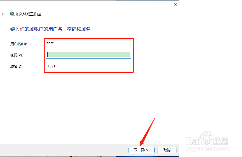 输入用户名密码和域名然后点击下一页完成。