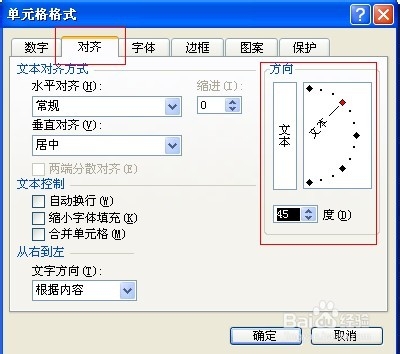 在“设置单元式格式”对话框中选择“字体”标签,在文本方向里选择方向,我这里选45度。你可试试其他角度。