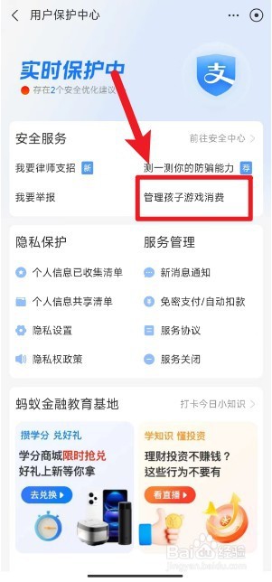 进入用户保护中心页面,点击右上角【管理孩子游戏消费】
