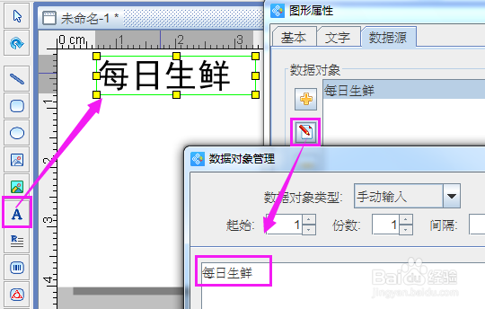 用条码软件左边工具栏的普通文本工具,在空白标签上添加一个普通文本,打开普通文本的属性数据源,修改为“每日生鲜”,然后再添加一个普通文本,同样是修改为“名称:”,然后点“+”添加一个数据,这次选择数据库导入生鲜名称。另外两个“产地”和“价格”也依次这样操作,导入对应的生鲜价格标签上的信息即可。