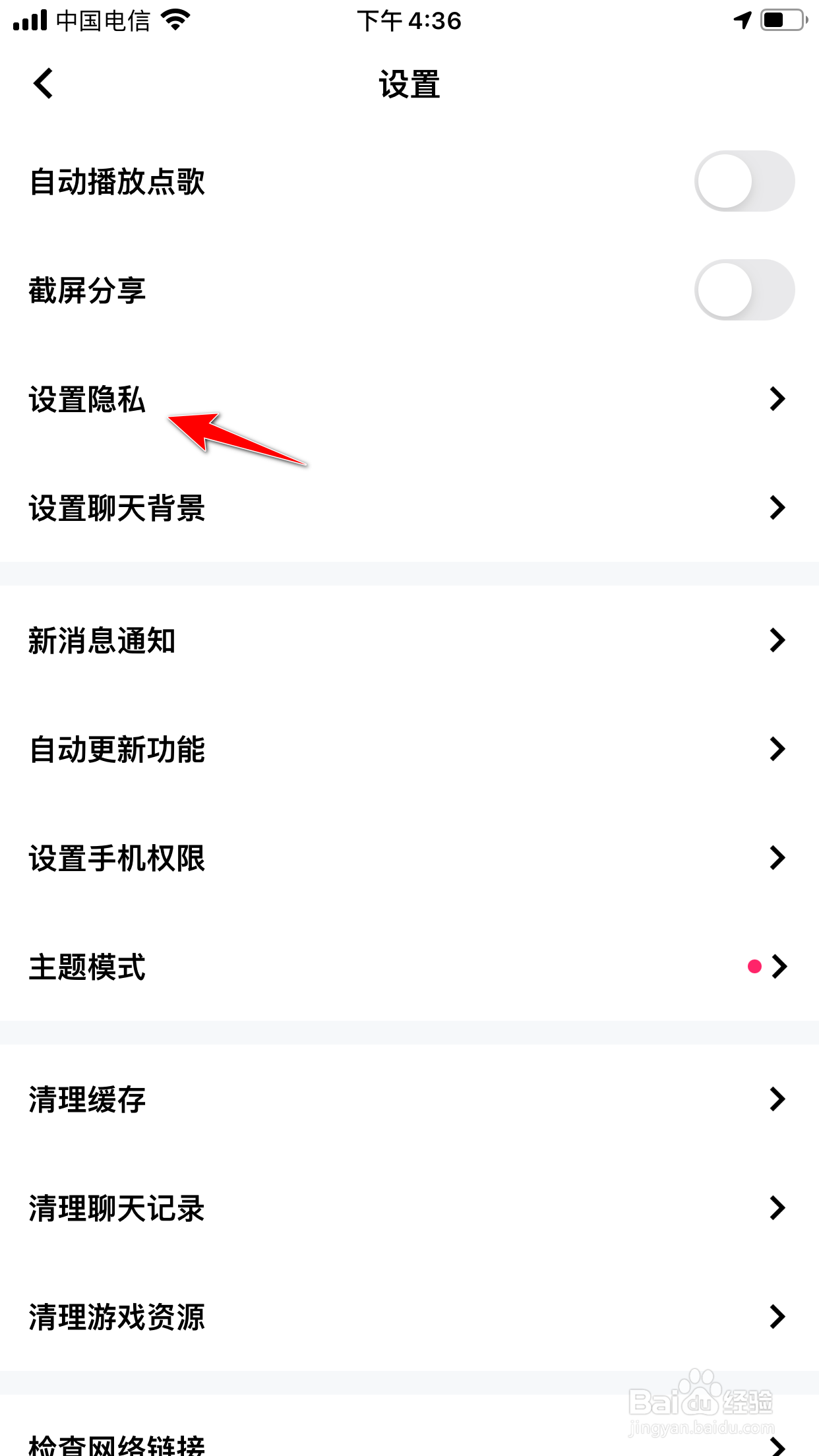 在设置中,点击设置隐私的选项。