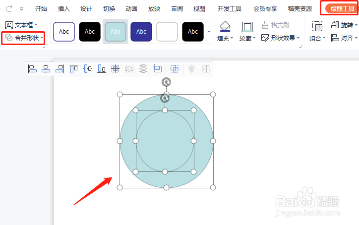 选中图形后,单击绘图工具选项卡,选择合并形状。