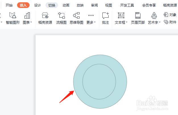 返回PPT,拖动鼠标,画出一个圆形,重复上一步操作,画出第二个圆形,并缩小放置在第一个圆形上面。