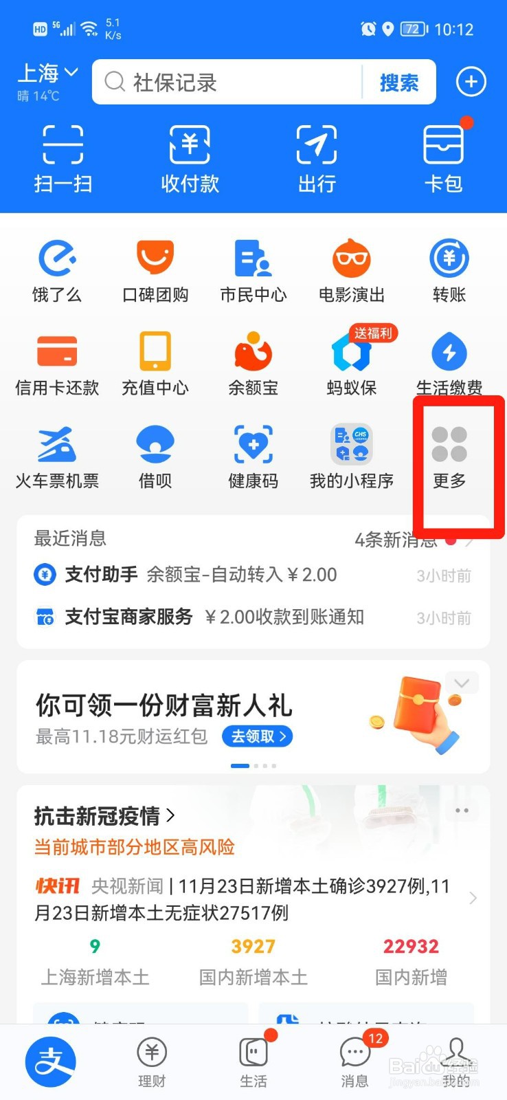 进入支付宝APP首页,点击【更多】,详见下图所示;