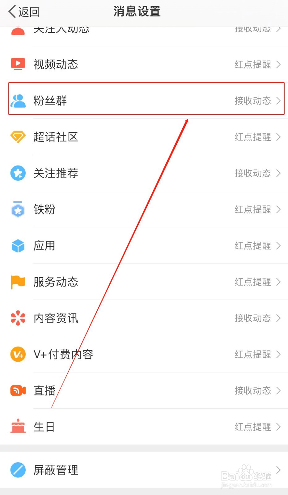 我们可以根据自己的需要,选择性地打开/关闭“接收博主空降粉丝群动态”、“数字提醒”等滑动开关。