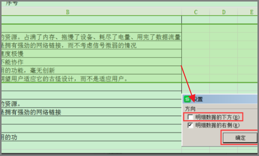 6、在弹出的对话框中取消掉“明细数据的下方”,然后点击确定按钮。