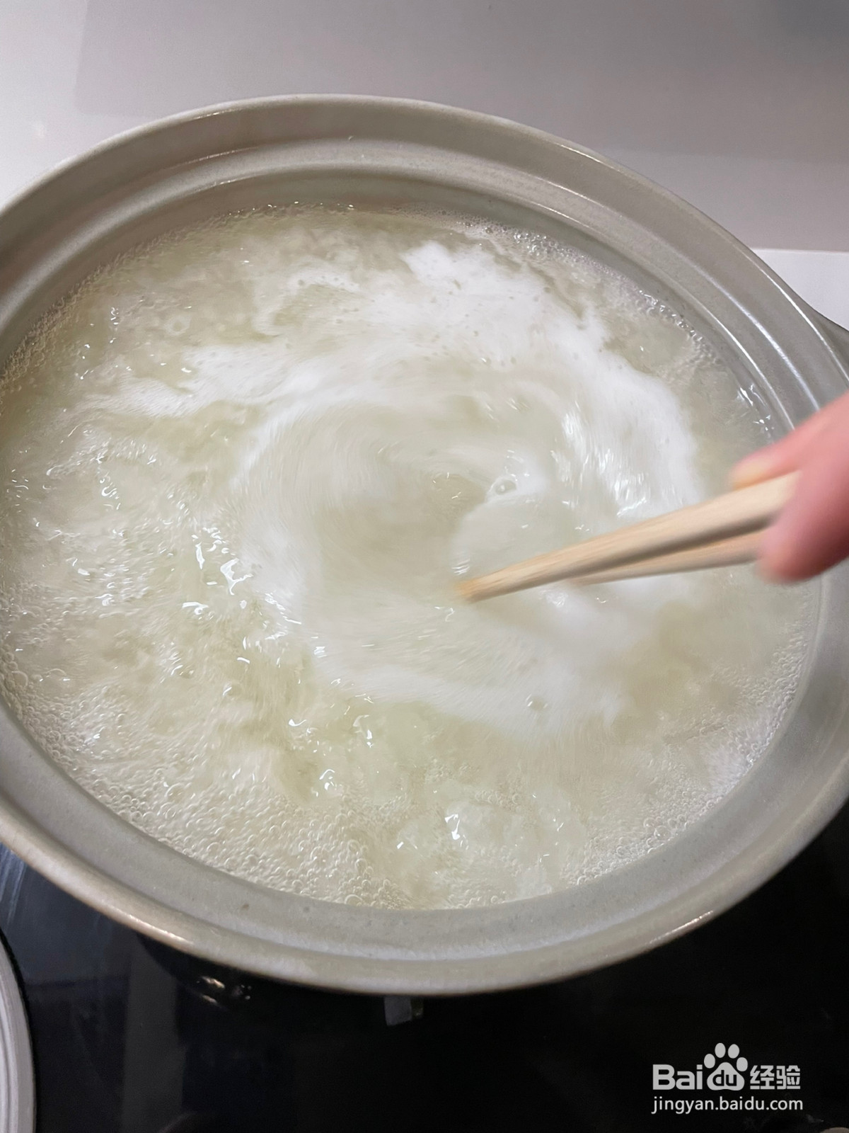快速出胶的秘诀,一双筷子,顺着一个方向快速搅拌,5分钟左右,很明显就会出胶