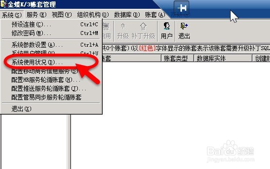 进入账套管理,点击左上角【系统】菜单栏,从弹出的快捷菜单中点击【系统使用状态】按钮。