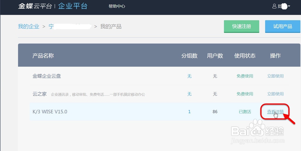 打开网页进入金蝶云平台,输入企业平台管理员用户名和密码登录,选择对应的ERP产品,点击【查看详情】。