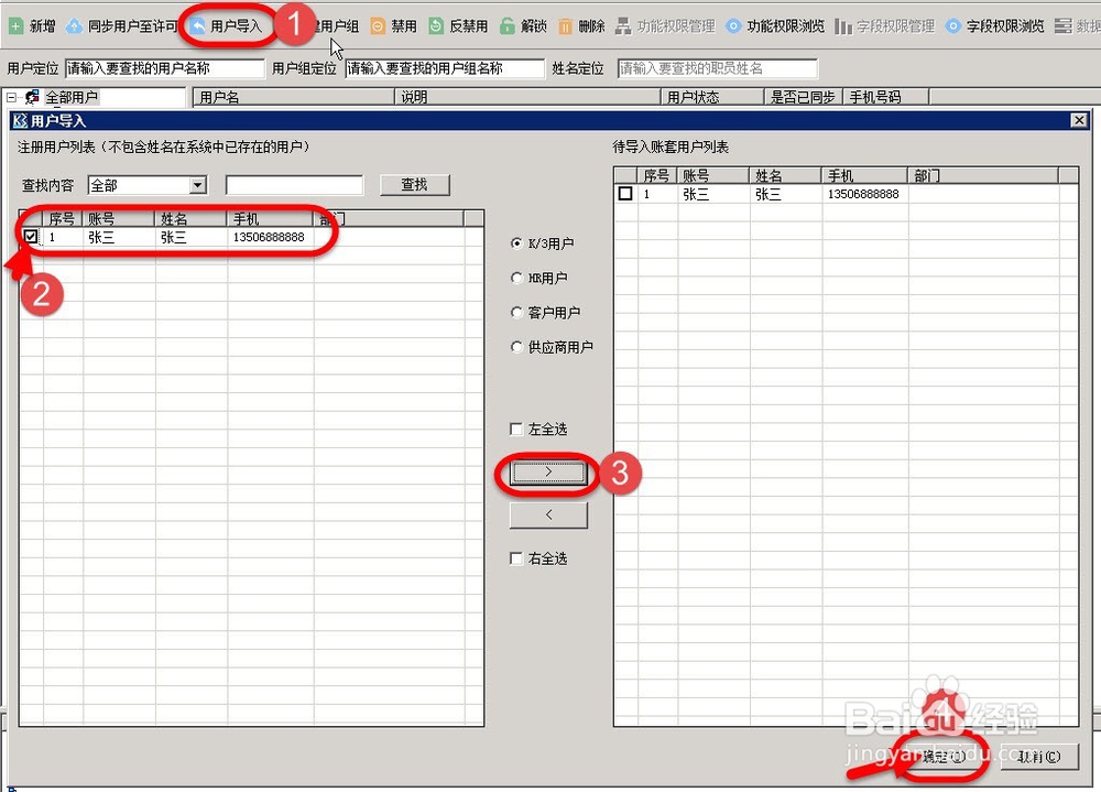 进入账套管理,选中相应的账套,点击【用户】-【用户导入】,勾选【张三】,点击【>】,最后点击【确定】按钮。