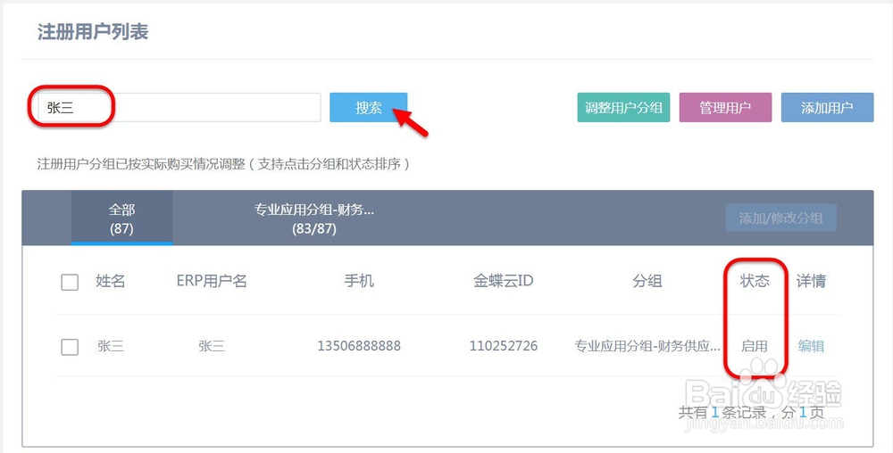 点击【确定】按钮后,新增用户此例【张三】添加完毕,可以在搜索栏录入【张三】点击【搜索】按钮来快速查找到,新增的用户默认处于【启用】状态。