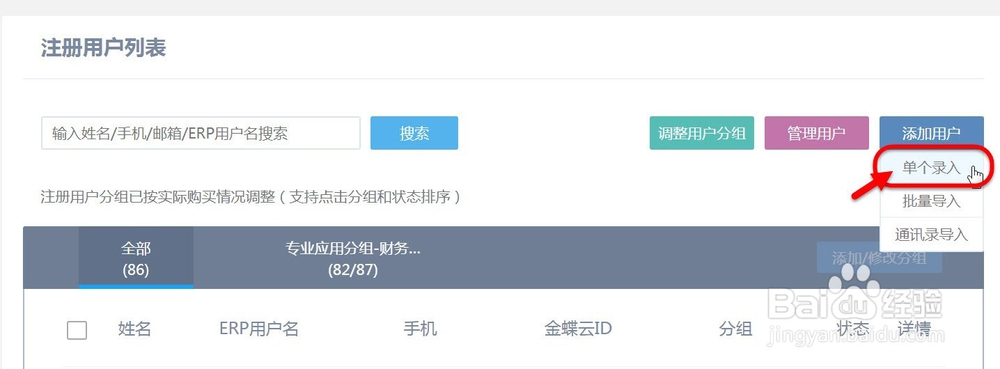 找到注册用户列表栏,点击【添加用户】,从弹出的快捷菜单中点击【单个录入】。