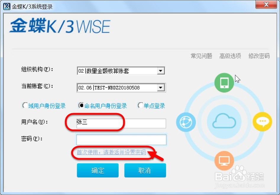 登录界面,用户名栏输入【张三】,再点击【首次使用,请激活并设置密码】链接。