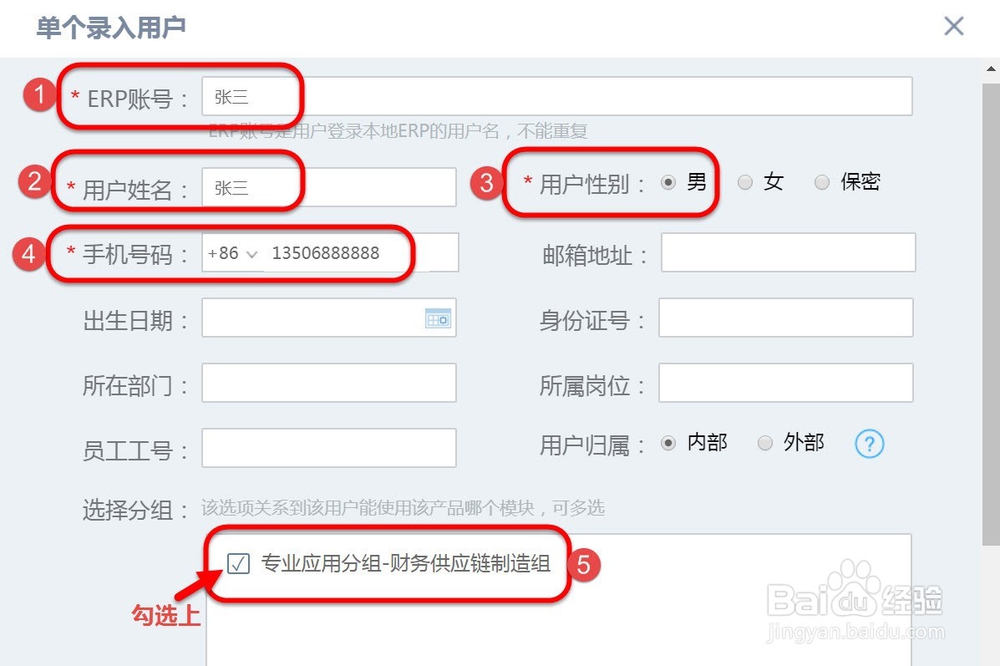 打开单个用户新增界面,带红色*的字段为必录项,一定要填写上内容,别的字段根据需要填写即可,最后不要忘记勾选【专业应用分组-财务供应链制造组】