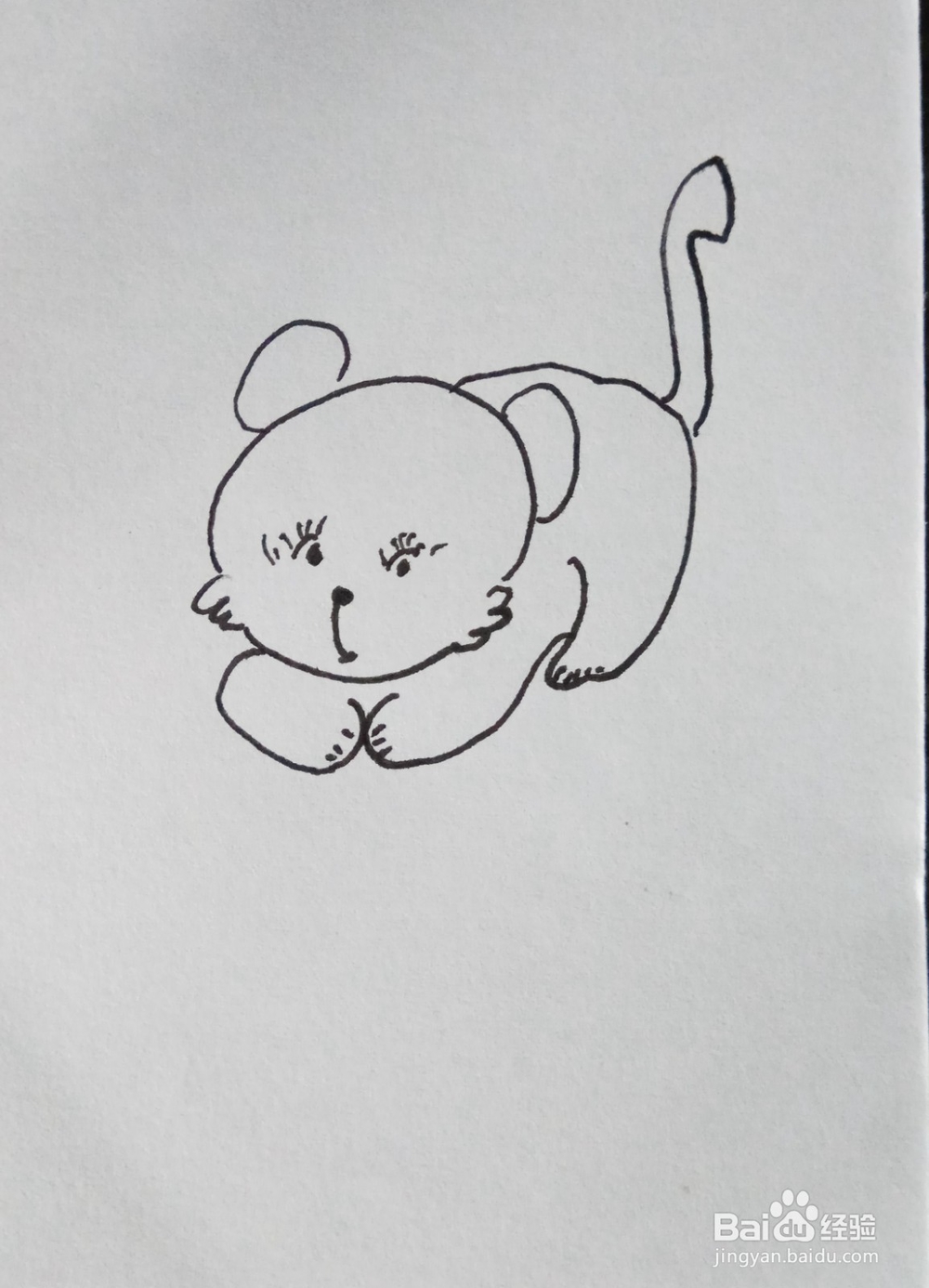 然后用曲线画出猫的两条前腿,猫正趴在地上,再用一条弧线画出猫的身体和后腿,小猫看东西是非常认真的,而且特别安静。