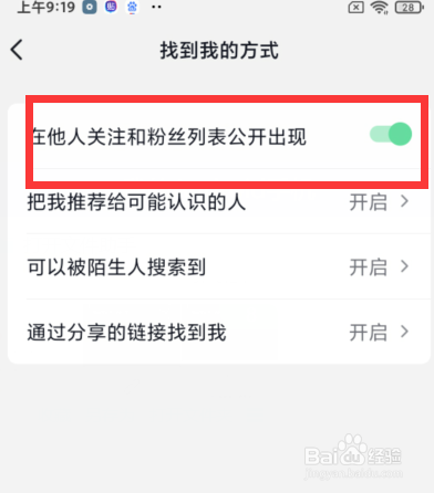 弹出窗口,点击第一个选项”在他人关注和粉丝列表公开显示“右侧的开关,关闭就可以了。