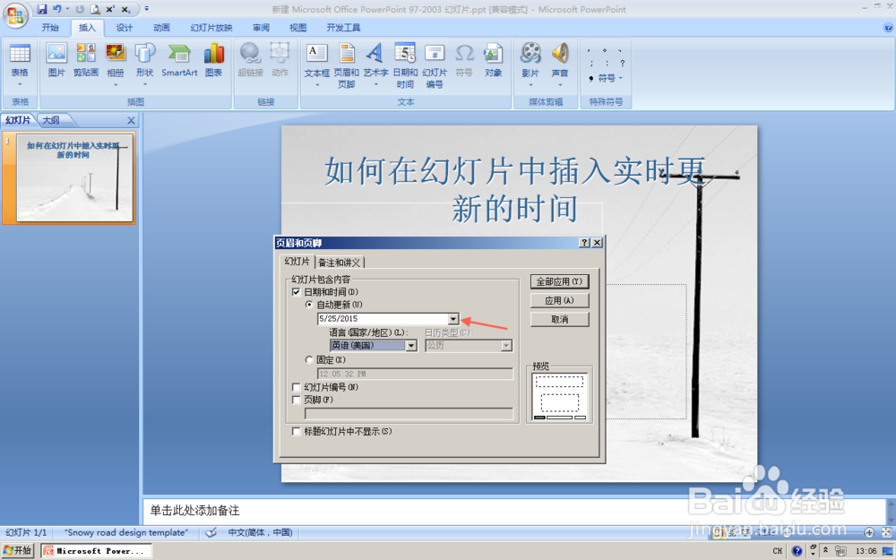 在弹出的名称为“页眉和页脚”的对话框中(这个对话框的名称同时告诉我们选择插入—页眉和页脚,也可以得到相同的结果),勾选“日期和时间(D)”,并选中“自动更新”按钮。箭头指的下拉菜单是选择格式,我们暂且不管,因为很可能第一次插入的格式我们并不喜欢,后面还要做出修改。点击“全部应用(Y)”后,在每一页ppt的左下角你都会看到一个显示年月日的日期,这是默认格式。