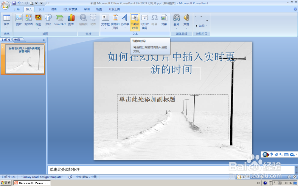 打开我们要使用的ppt文件,在上方的工具栏选择“插入”选项卡,选择插入一个“日期和时间”文本。