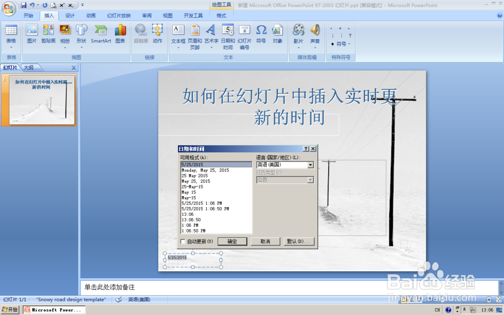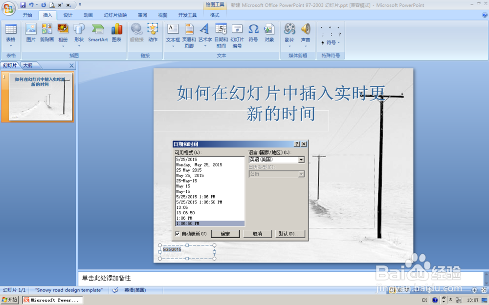 修改时间格式时,特别要注意的是要记得勾选最下面的“自动更新(U)”,不然插入时间后默认的是当前时间,不会实时更新。