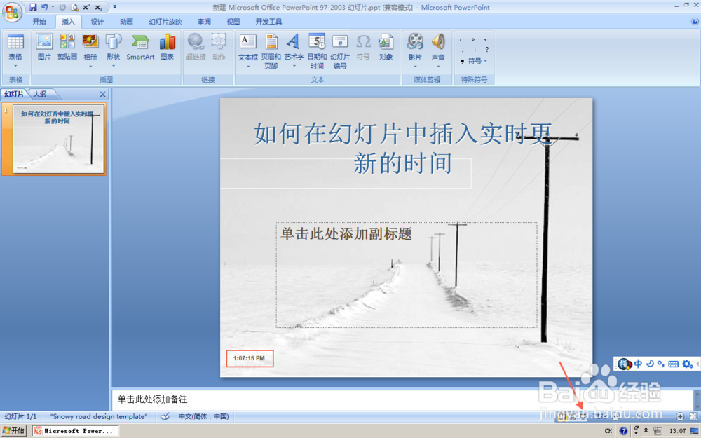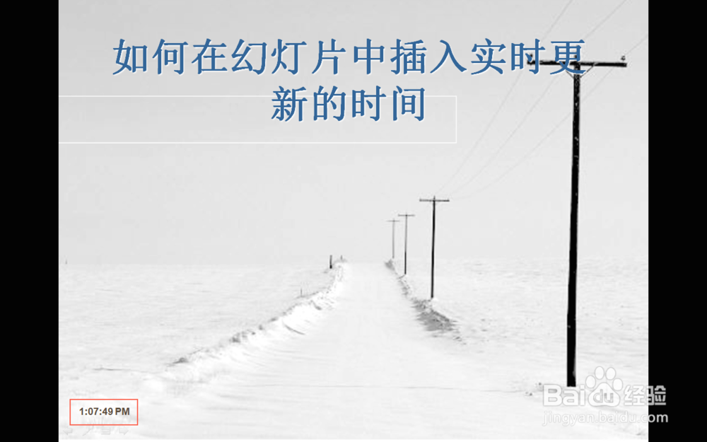 来源:网络收集 点击: 时间:2025-11-25在使用ppt展示我们的工作成果时,如果在幻灯片中插入实时更新的时钟,看上去会略显高大上,而且在讲述的过程中,我们可以参考上面的时间来调整讲演的进度。既可以为工作增色又很实用的小时钟仅需几步就可以完成。