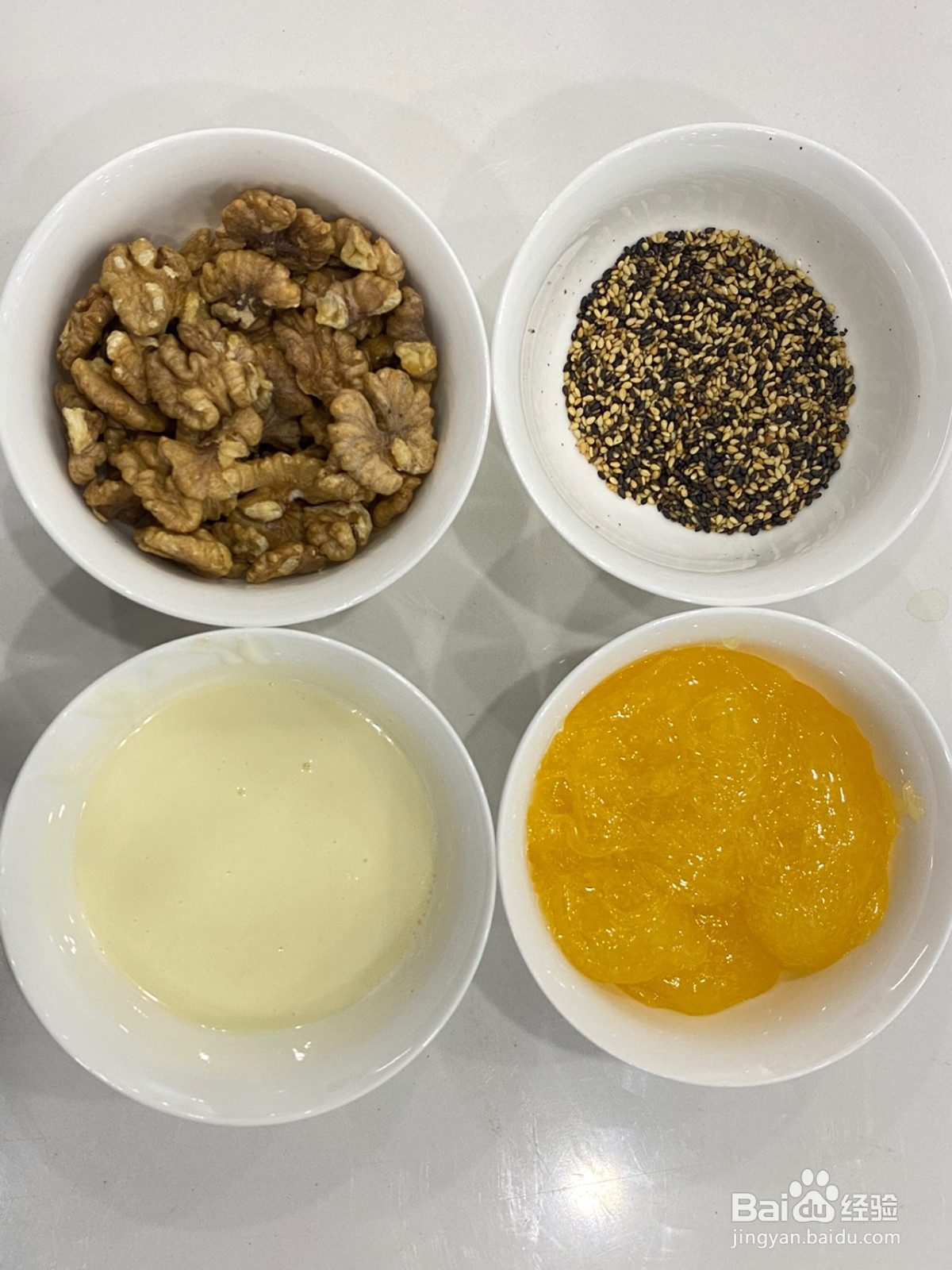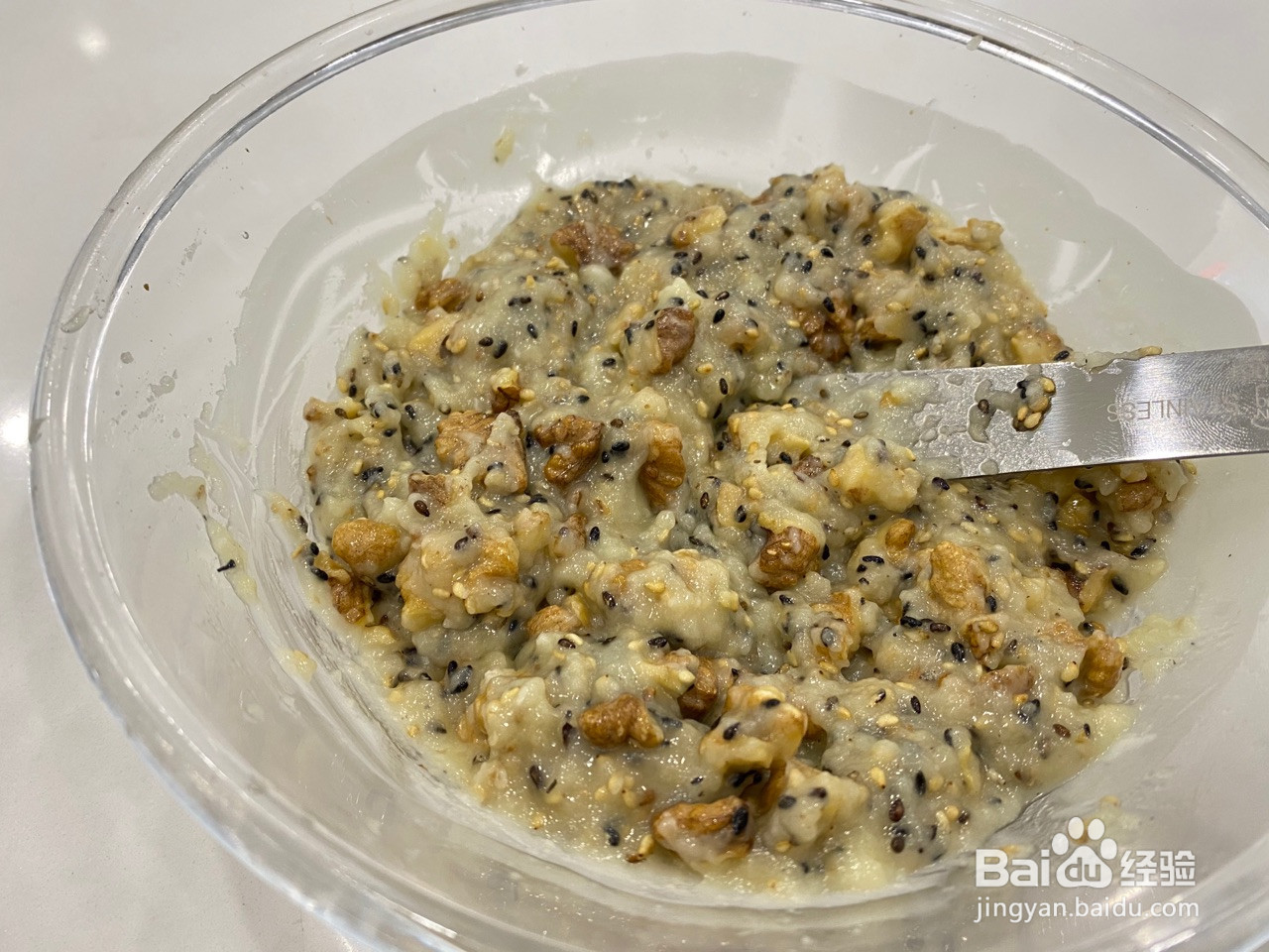 先将白巧酱和燕麦酱混匀,加入烤熟核桃仁和熟的黑/白芝麻