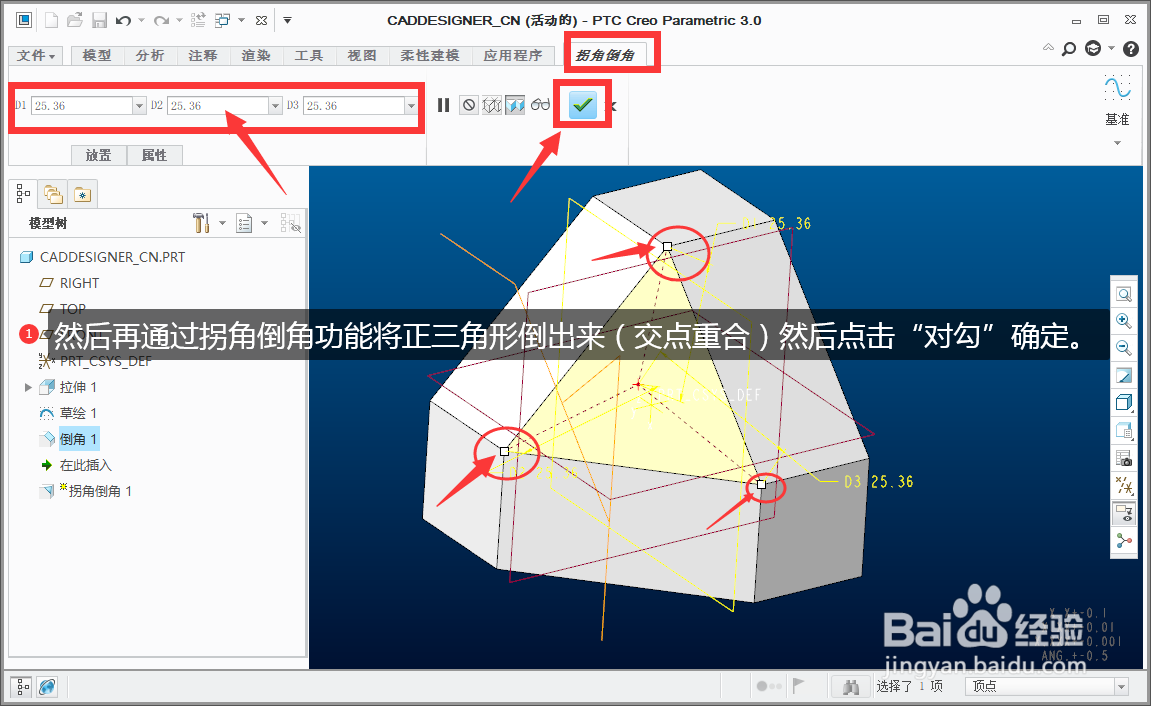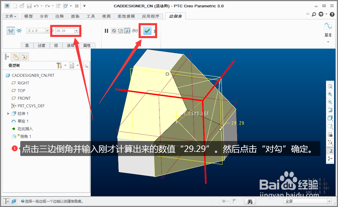 点击三边倒角并输入刚才计算出来的数值“29.29”然后点击“对勾”确定。