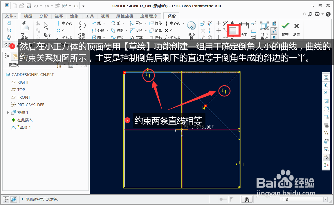 然后在小正方体的顶面使用【草绘】功能创建一组用于确定倒角大小的曲线,曲线的约束关系如图所示,主要是控制倒角后剩下的直边等于倒角生成的斜边的一半。