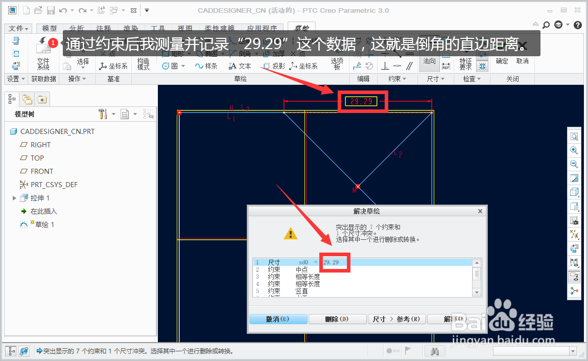 通过约束后我测量并记录“29.29”这个数据,这就是倒角的直边距离。