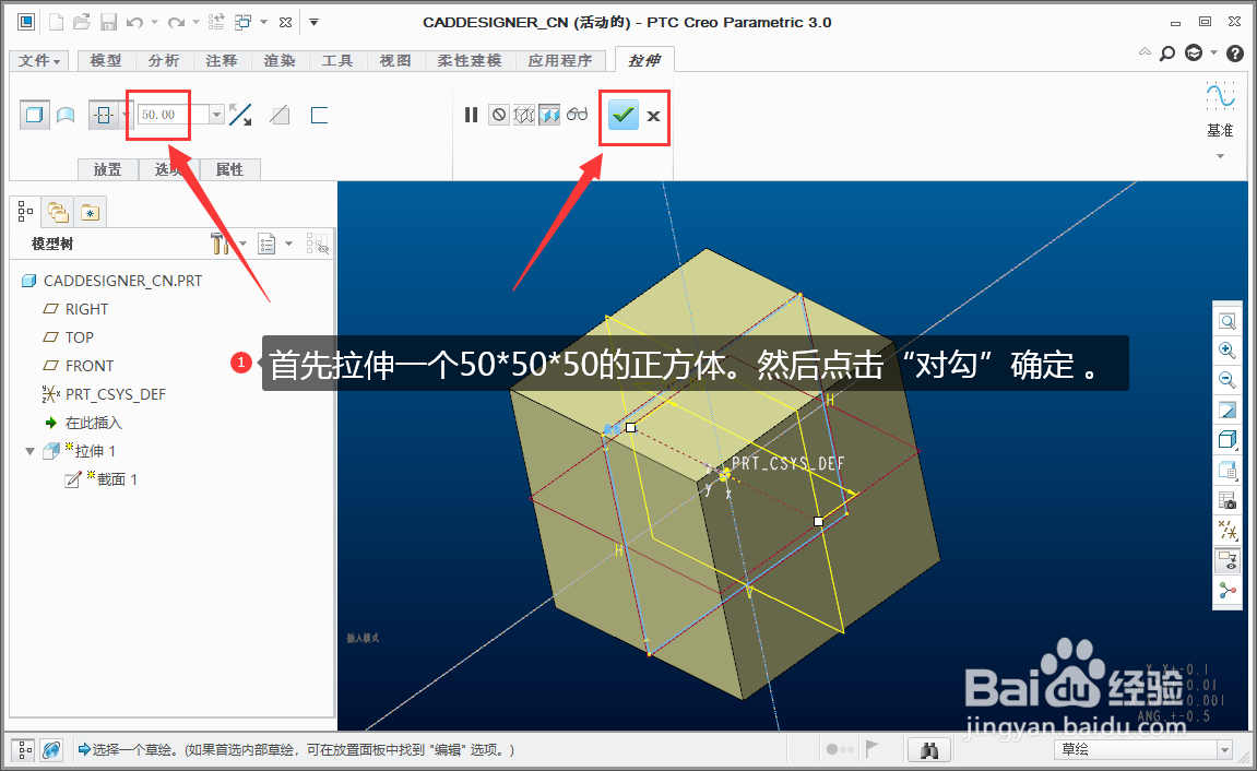 首先拉伸一个50*50*50的正方体。然后点击“对勾”确定。
